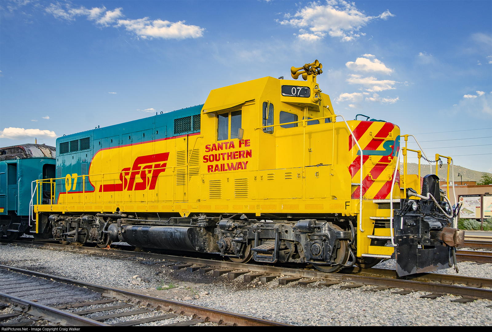 Santa Fe Southern GP7 07 was built by EMD in August 1952 as Atchison Topeka & Santa Fe 2744. The Santa Fe rebuilt it as a GP7u and numbered it ATSF 2234. It was eventually sold to the Texas-New Mexico Railroad (as TNMR 2234), and it eventually transferred to the Dallas Garland & Northeastern Railroad (DGNO 701), from there, to the Santa Fe Southern, where it remains today (“today” being 2022), as their engine SFS 07, as seen in Santa Fe, New Mexico, on May 17, 2013.