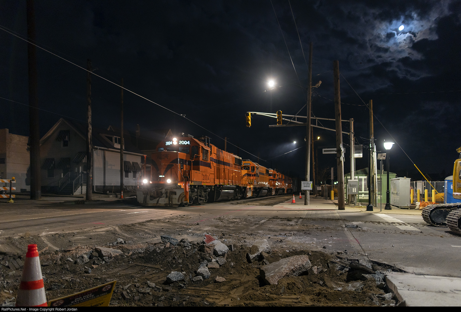 Eastbound South Shore Freight crosses Jefferson St past the site of the former 11th Street Station. The little Kiosk station is still there. Houses along the north side of the street east have been removed. In this area pavement on either side of the tracks is removed.