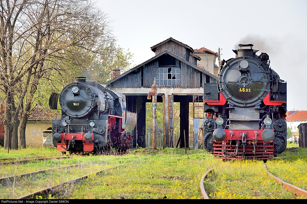 The two Bulgarian steam locomotives 16 27 and 46 03 are resting at the Momchilgrad shed after a long day out on the line.