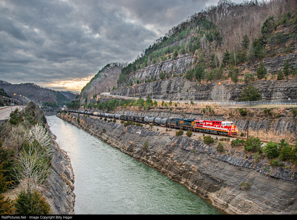 Westbound CSX Q694-18 passes through the Pikeville Cut Through just after sunrise with the CSX 911, the specially painted Honoring First Responders engine, in the lead.