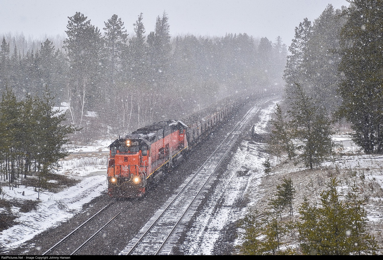Heavy snow slams the Iron Range on a spring afternoon in Northern Minnesota as a rare pair of Bessemer & Lake Erie SD40T-3’s lead a T-Bird south past the Route 37 bridge as they close in on the mine at Fairdale.