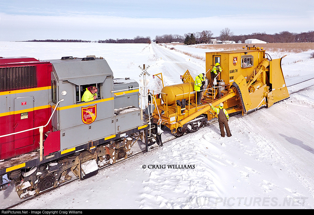 | The Iowa Northern's Jordan works north on the Oelwein Sub towards Oelwein back in early 2021. Past Fairbank there hadn't been any trains for a few days, but in the end the drifts were pretty minor for the middle of February. Snow melts and light snow storms didn't produced much for drifts in early 2021 and the Jordan only got used twice that winter. Here the crew takes a quick break to chat with the MofW boss. |