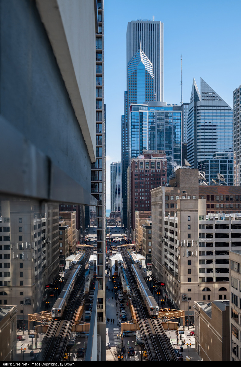 | After having just departed the State/Lake station above its namesake intersection, a CTA Green Line train scurries west splitting the canyon of buildings in downtown Chicago. |
