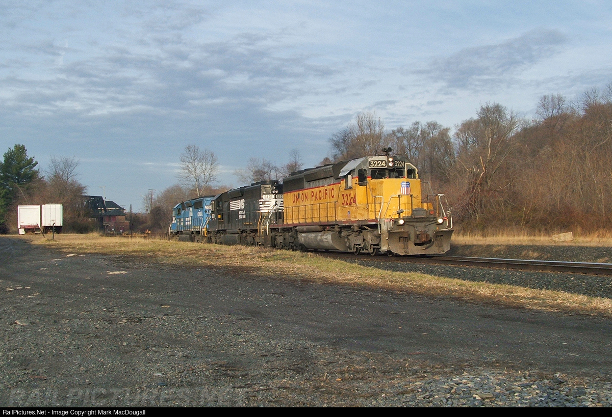 | One of the more interesting sets of power that ended up on the NS Lehigh Line in the 00s was this 212, with sported three SD40-2s in UP, NS and Conrail paint. They're seen having just passed PU Tower as they're notched up at the beginning on the climb up towards Pattenburg. |