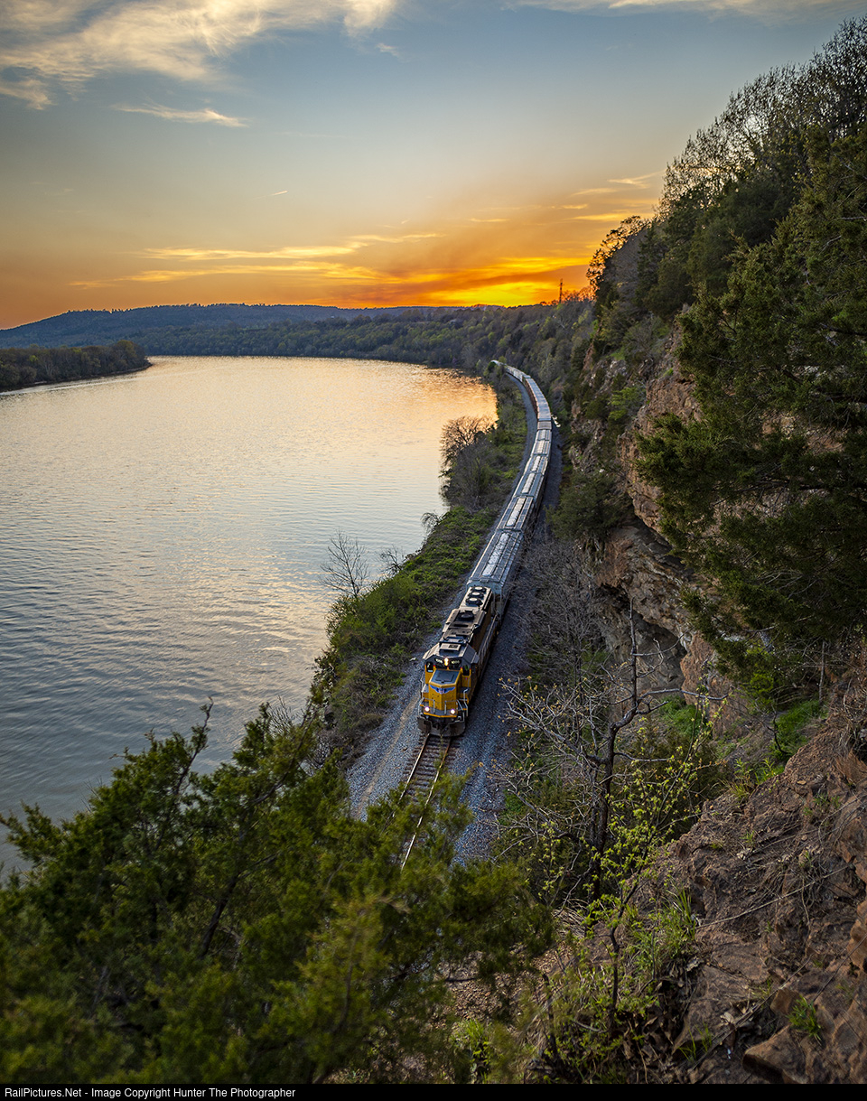 Working solo, GP60 number 1086 leads a mixed consist of cars southbound below the bluffs of Ozark, AR alongside the Arkansas River late in the day on a warm April 9, 2022.