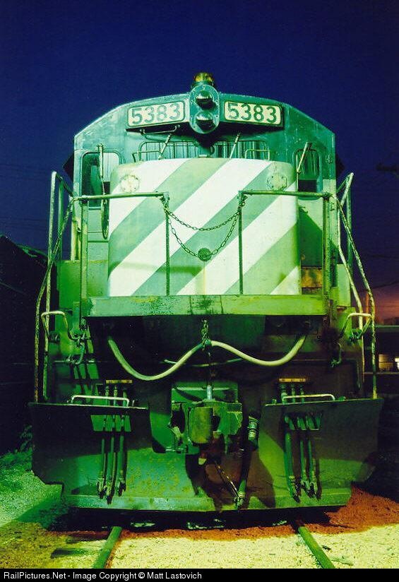 BN 5383 a member of the Illinois Railway Museum sits out side of Barn 9 on a nice summer night.