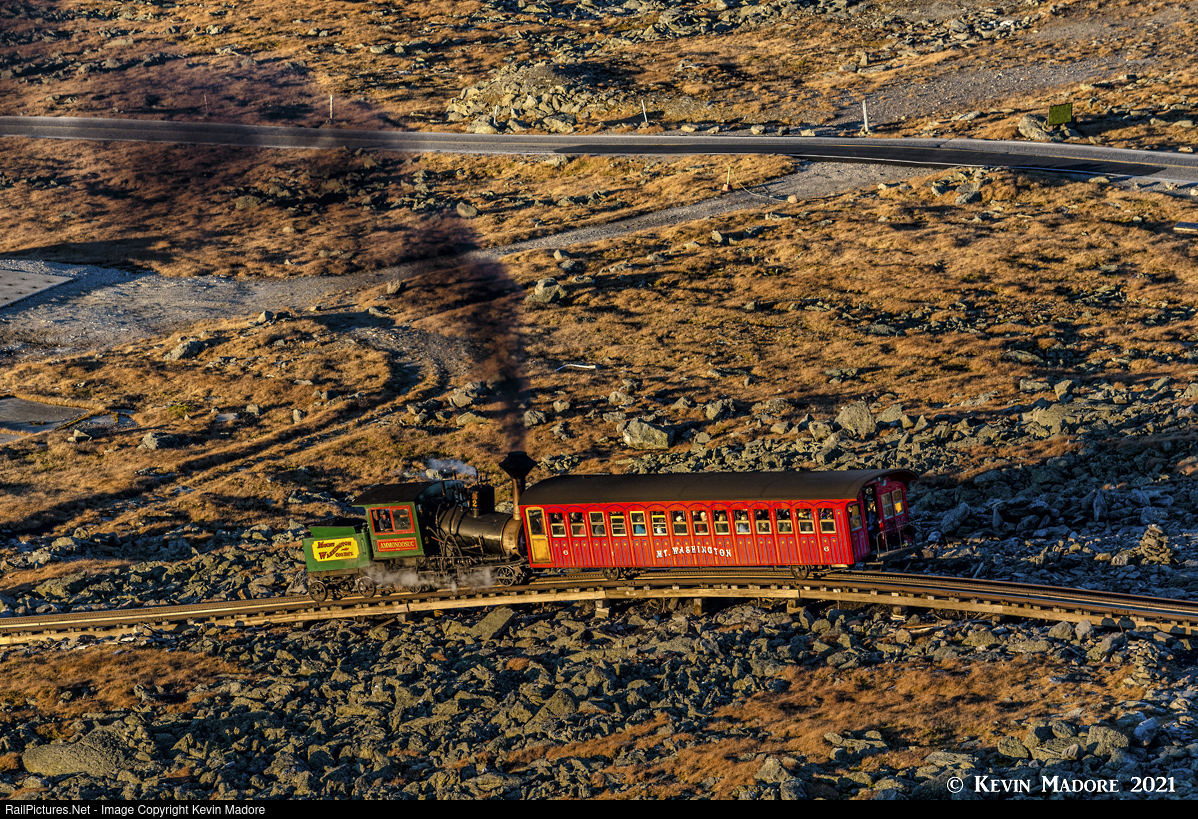 And yes, that stretch of pavement in the upper portion of this photo is the Mt. Washington Auto Road, which comes up the east side of the mountain. Right here below the summit is the only place where the railway and the road actually converge. Since the railway and the auto road are on opposite sides of the mountain, their respective base terminals are actually quite far apart. I believe the drive between the two is something like 46 miles and takes about an hour and 10 minutes to complete.