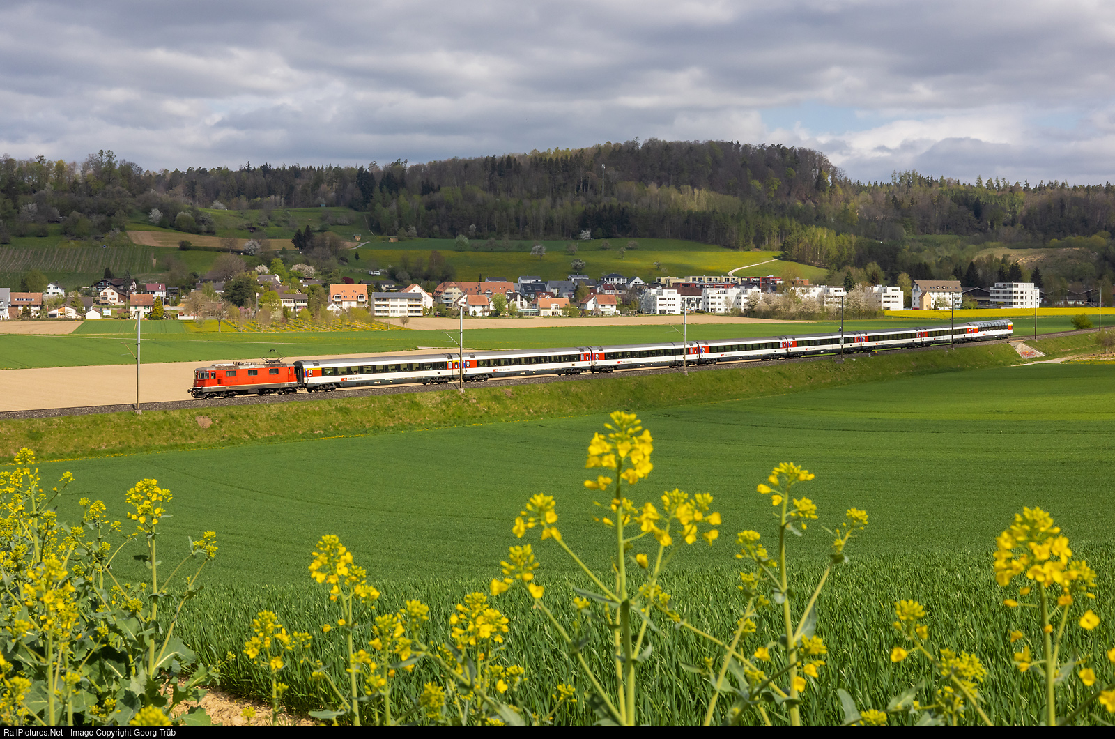 Re 420 # 144 (Re 4/4 II # 11144) of the SBB, first series with sissor pantograph, is pulling the reinforced IC 183 Stuttgart-Zürich, on the lap between Singen (Hohentwiel) and Zürich, between Lottstetten and Rafz. In the rear of the train is a first class panorama car Apm, not running on this line usually. The easter weekend and the interruption of the german Rheintal line north of Basel due to track works caused extremely high passenger frequencies on the axis Zürich-Stuttgart and vice versa.