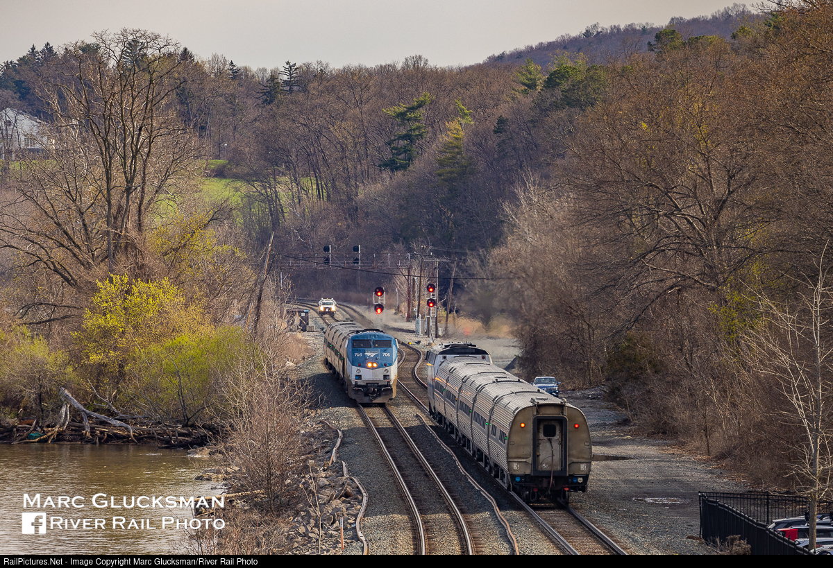 Reds At Rhinecliff. A three way meet of sorts occurred at CP 89 just north of the Amtrak Rhinecliff Station on the morning of April 21, 2022. With a hi-rail vehicle sitting behind it on Track 2, Train 236 (Empire Service) had gone over the switch from Track 1 to Track 2 while Train 63 (Maple Leaf) waited for it to clear. Train 236 is lead by AMTK 706, one of 18 P32AC-DMs used in Empire Service, and the only one presently in Phase V paint. The rest of the fleet has been or is being repainted into a version of Amtrak's Phase III paint scheme.