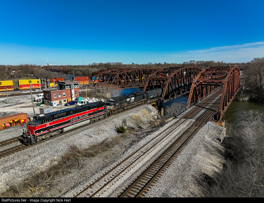 | The Rock Island heritage unit begins its shove move to IHB's Blue Island Yard as it crosses the Cal Sag Channel at Blue Island Junction. The interlocking tower is no longer manner but is still used for Maintenance of Way. |