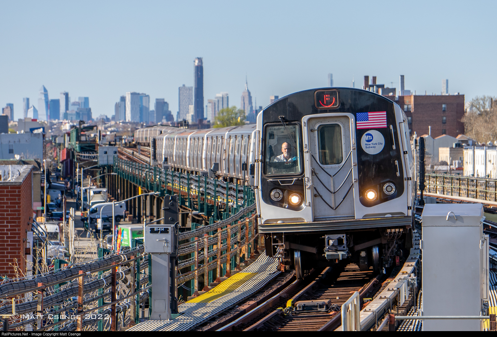 A Coney Island-bound (F) train is seen arriving at Kings Hwy station on the afternoon of April 22, 2022. The Manhattan skyline stands tall in the background here, with the bustling cityscape of Brooklyn surrounding the scene.