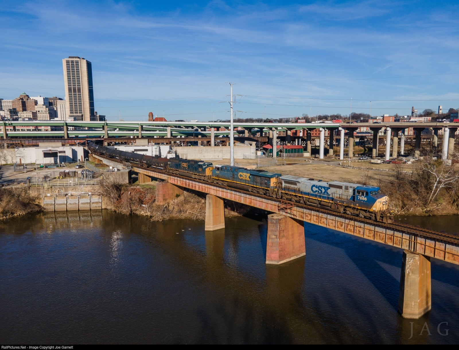 Leaving behind the capitol city skyline as it crosses the James River, loaded ammonium train W943 sports a nice leader for 2022, CW40-8 #7886, wearing it's as-delivered YN2 paint scheme. The bridge they're crossing is showing its lineage as well, with the 'Seaboard' lettering visible below the lead locomotive. About 10 cars deep in the train is the famous triple crossing, who's view is now sadly mostly obscured by the Richmond Flood Wall.