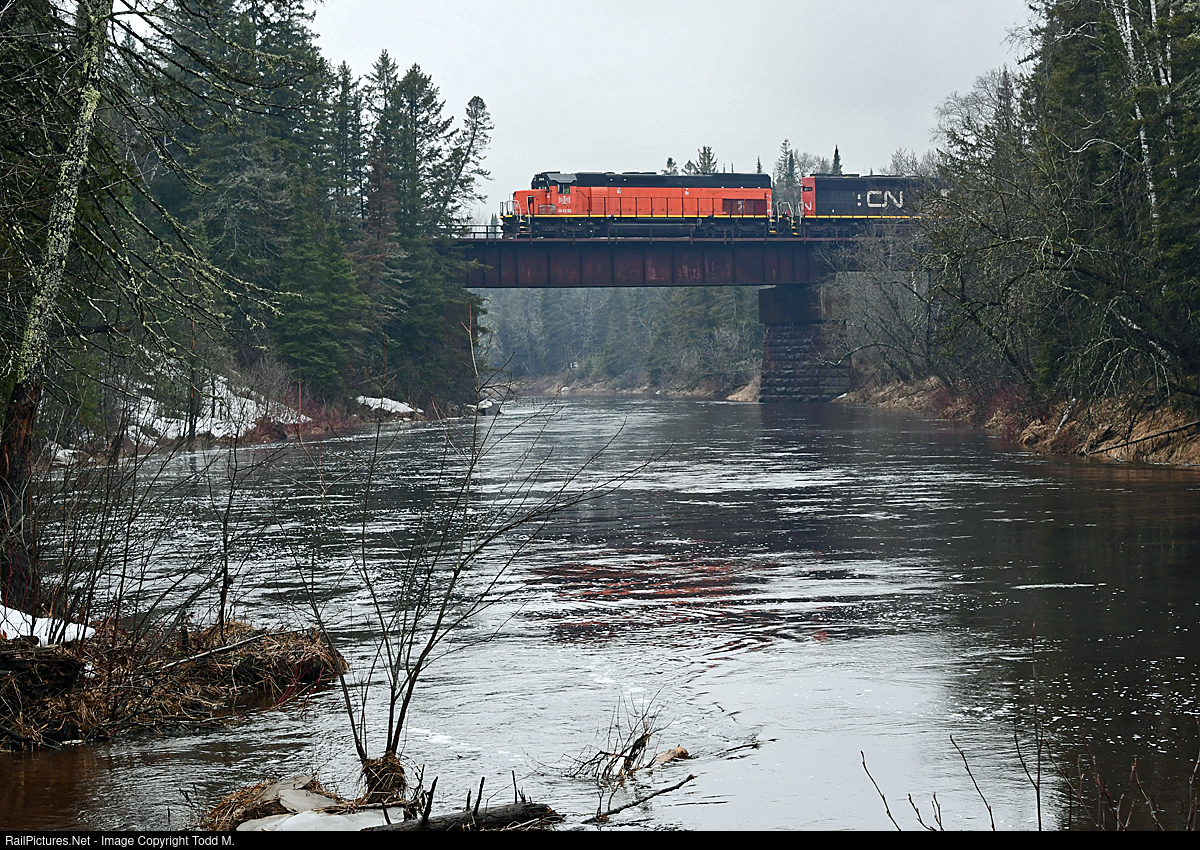 A little fog in the air yet as BLE 906 is passing over the spring melt and rain swollen St. Louis River on the way to the United Taconite plant.