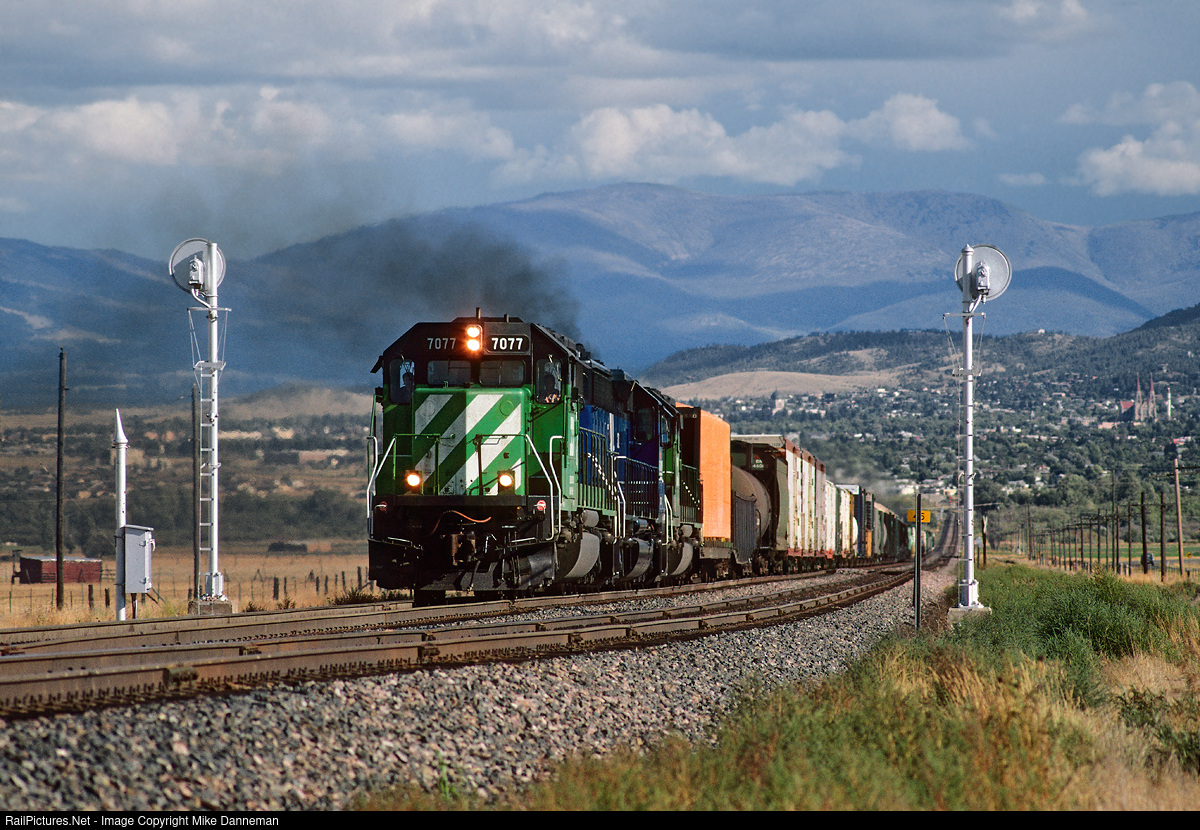 Beginning the arduous climb over Mullan Pass is Burlington Northern train 123 at Tobin, just west of Helena, Montana, on September 10, 1995. A portion of the city of Helena can be seen in the background, including the grand Cathedral of Saint Helena on the far right.