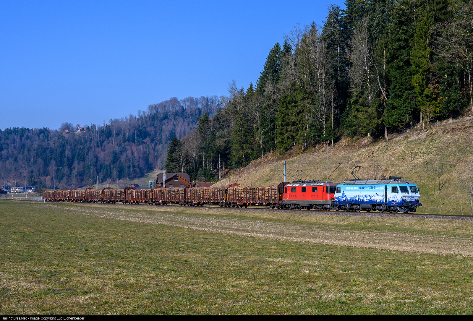 | The Re 446 018 together with the Re 420 121, which is currently leased from EDG, are as 69451 from Murgenthal to Menznau to SWISS KRONO AG. Here taken shortly after Wilisau, just before reaching the finish. |