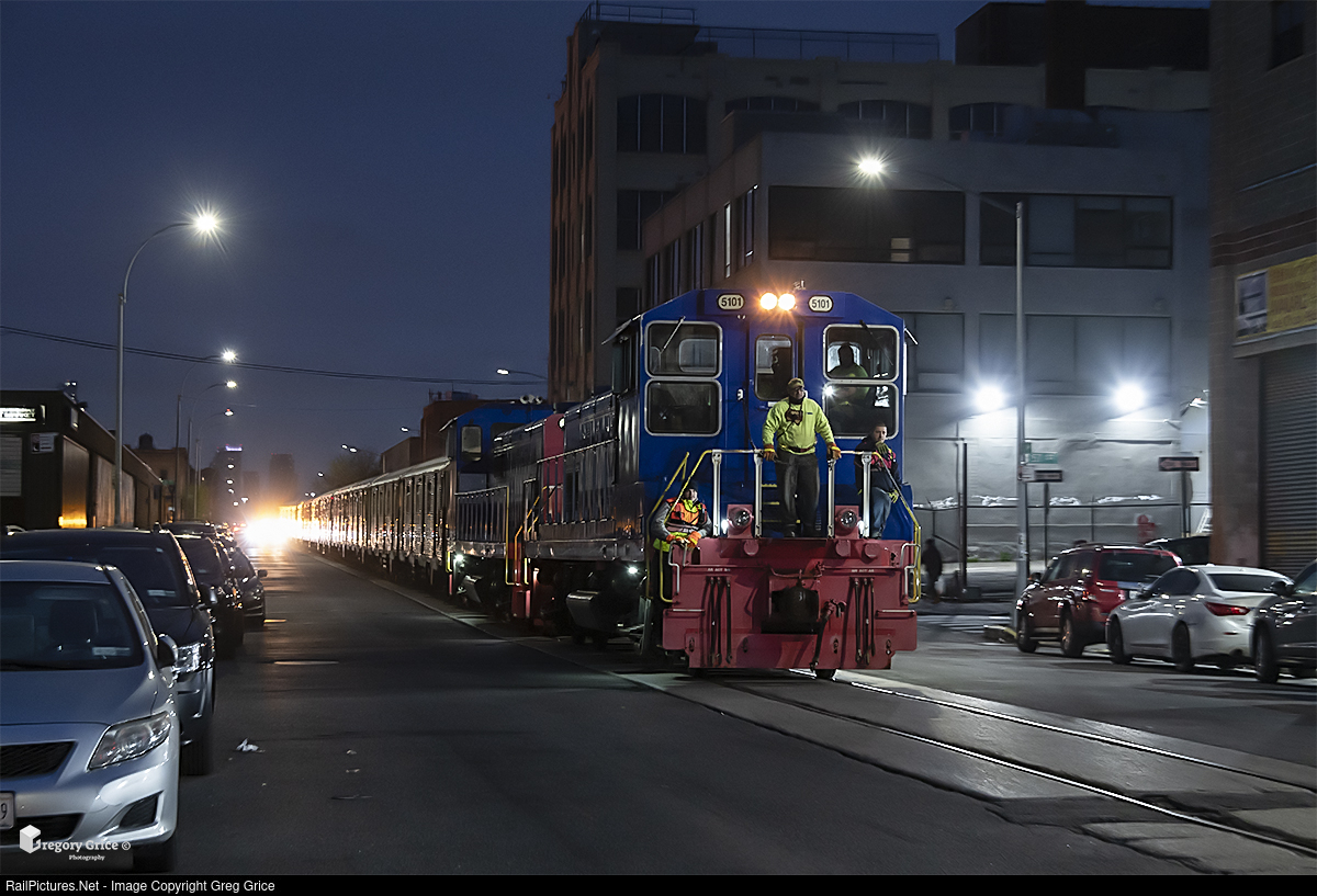 On the morning of April 26th, 2022, New York New Jersey Rail's "Brooklyn crew" makes their way down 1st Avenue towards 65th Street Yard with 12 decommissioned New York City Transit Budd R32 subway cars in tow. Once at 65th Street Yard, the cars will be loaded onto flatcars for the journey to Ohio for scrapping.