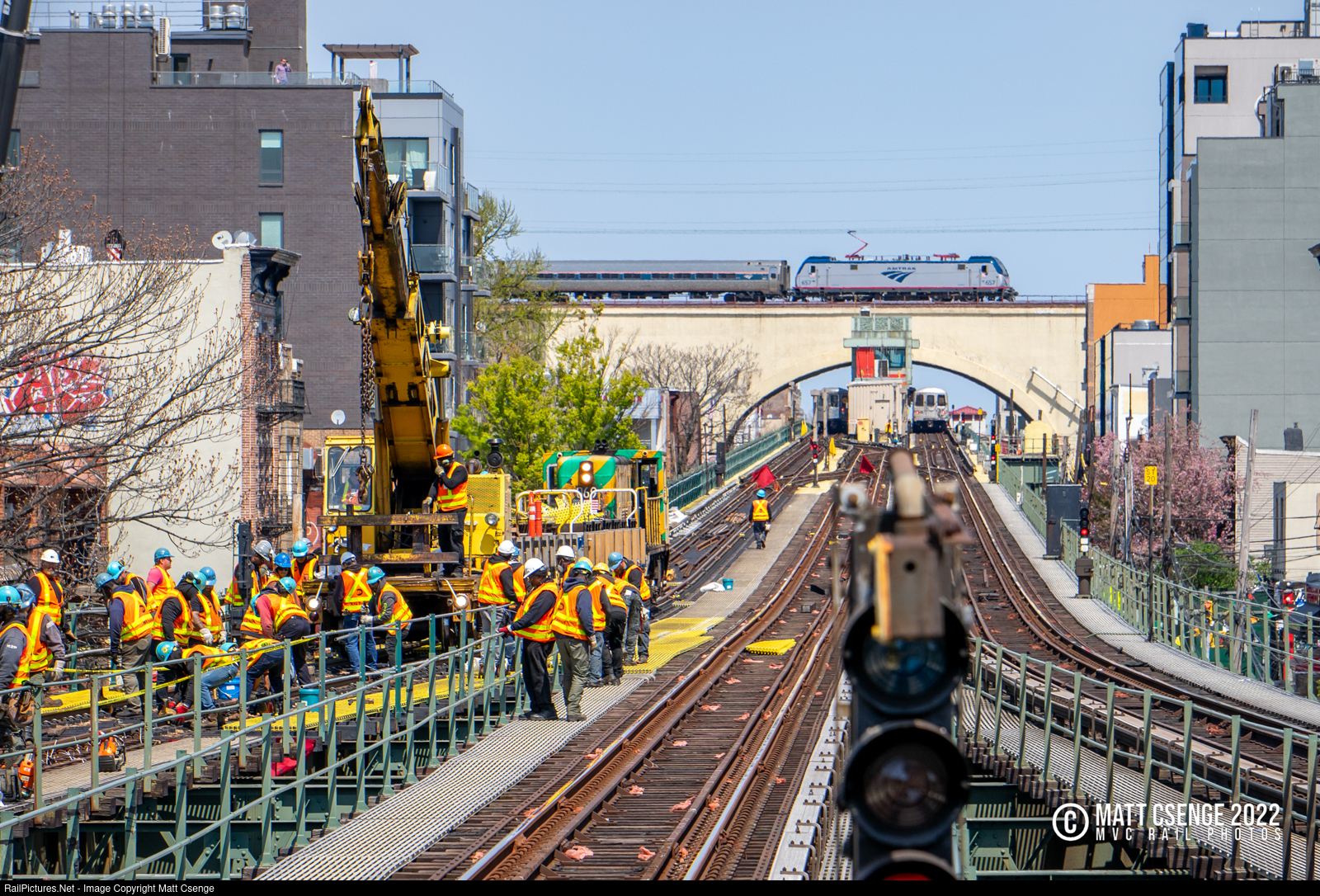 Amtrak ACS-64 237 is seen leading train 161(24) down the Hell Gate Bridge into Queens, passing over the Astoria Line of the NYC Subway. Weekend work was well underway on 4/24/2022, with a work train consisting of R47 locomotive 069, R252 flat car OF823, and R102 crane car OC277 assisting with track panel replacement.