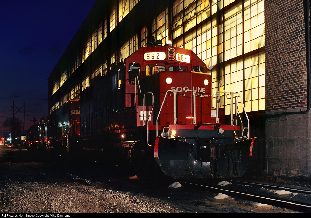 Several Soo Line and Milwaukee Road units rest outside the illuminated enginehouse at the locomotive facility at Bensenville Yard in Bensenville, Illinois, on the night of December 5, 1987.