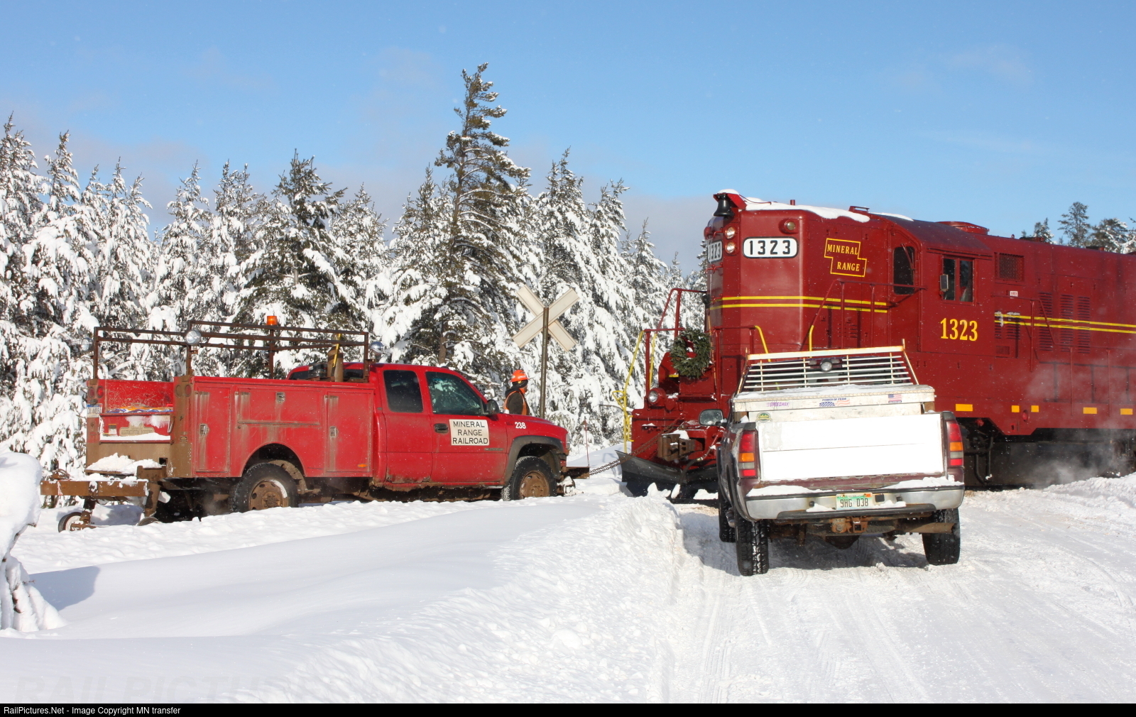 A foreman was working ahead of the train on this day when his hi-rail truck suffered a transmission failure at Humboldt junction. When the Humboldt turn approached, the crew cut off their cars at the nearest grade crossing, ran the light power out to the junction and used a chain connected to the front of the 1323 to tow the disabled truck back to the crossing. Before long a railroad employee had arrived with another pickup and pulled it clear of the track to be retrieved later by a wrecker, allowing the train to continue on its way.