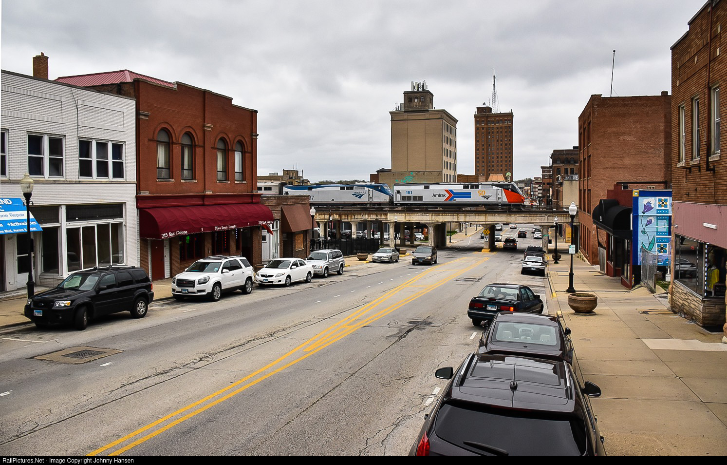 On a gloomy Sunday afternoon in Downtown Aurora, the eastbound Southwest Chief sprints over Galena Blvd on the 2,000 foot long elevated trackage splitting through the heart of downtown, which was completed in the 1920’s. Two P42DC’s, the lead locomotive being the new Phase I heritage unit lead the 1 hour late ‘Chief’ onto the last miles until its destination of Chicago.