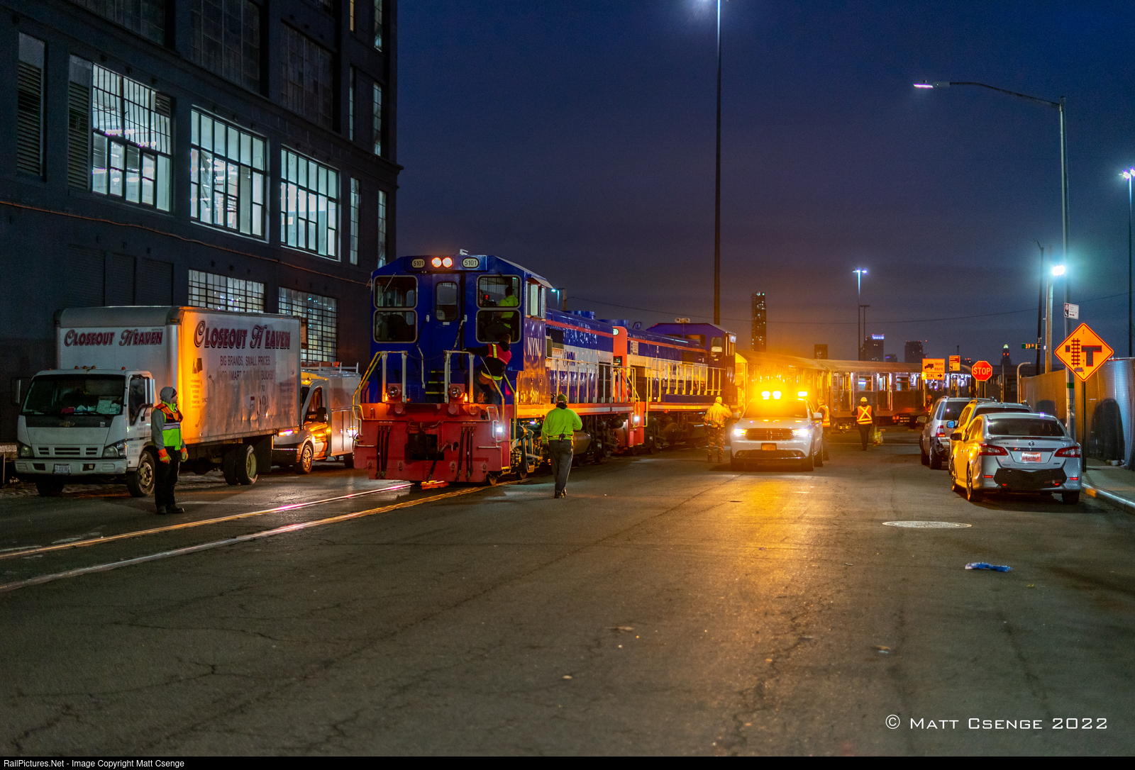 Officially Off the Property. NJNY Rail 5101 and 5103 are seen tying onto the end of a 12-car string of R32 cars. The R32s are being sent for scrap after 58 years of service in the Subway, and are officially off the property and entering NYNJ's hands for the move via carfloat to New Jersey.