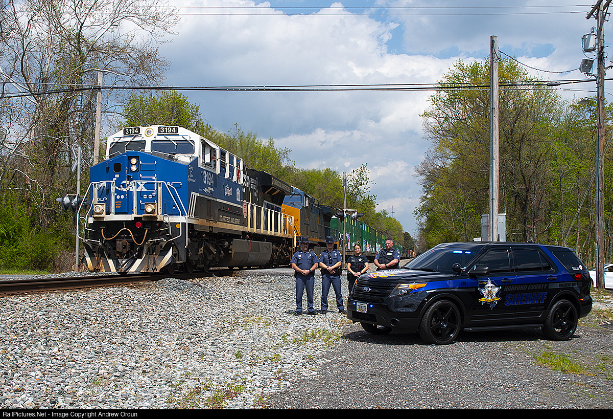 Q409-02 with 3194 leading passes BAK 75.1. Lined up at the crossing are a group of Harford County Sheriff’s Office Deputies, and the department's specially painted tribute car, honoring members who have been killed in the line of duty.