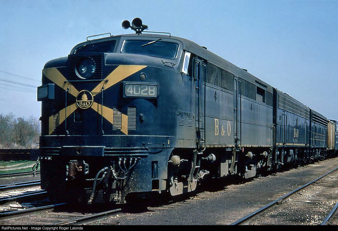 At Springfield's B&O yard, an Alco FA-2 and two F7B's led by 4028 in the famous "Sunburst" paint scheme. This was one of the "modern" changes which took place during the B&O's Langdon years of 1961-1964. Photo by J.W.Young , photo part of my slide collection.