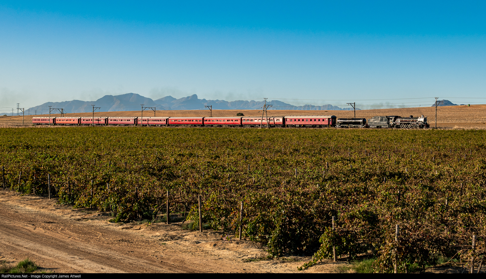 'Steam in the Cape winelands...' Ceres Rail Company's class 19D - No.3322 - is seen here racing past a vineyard close to Hermon on the Cape mainline, following a day trip to Ceres on Freedom day.