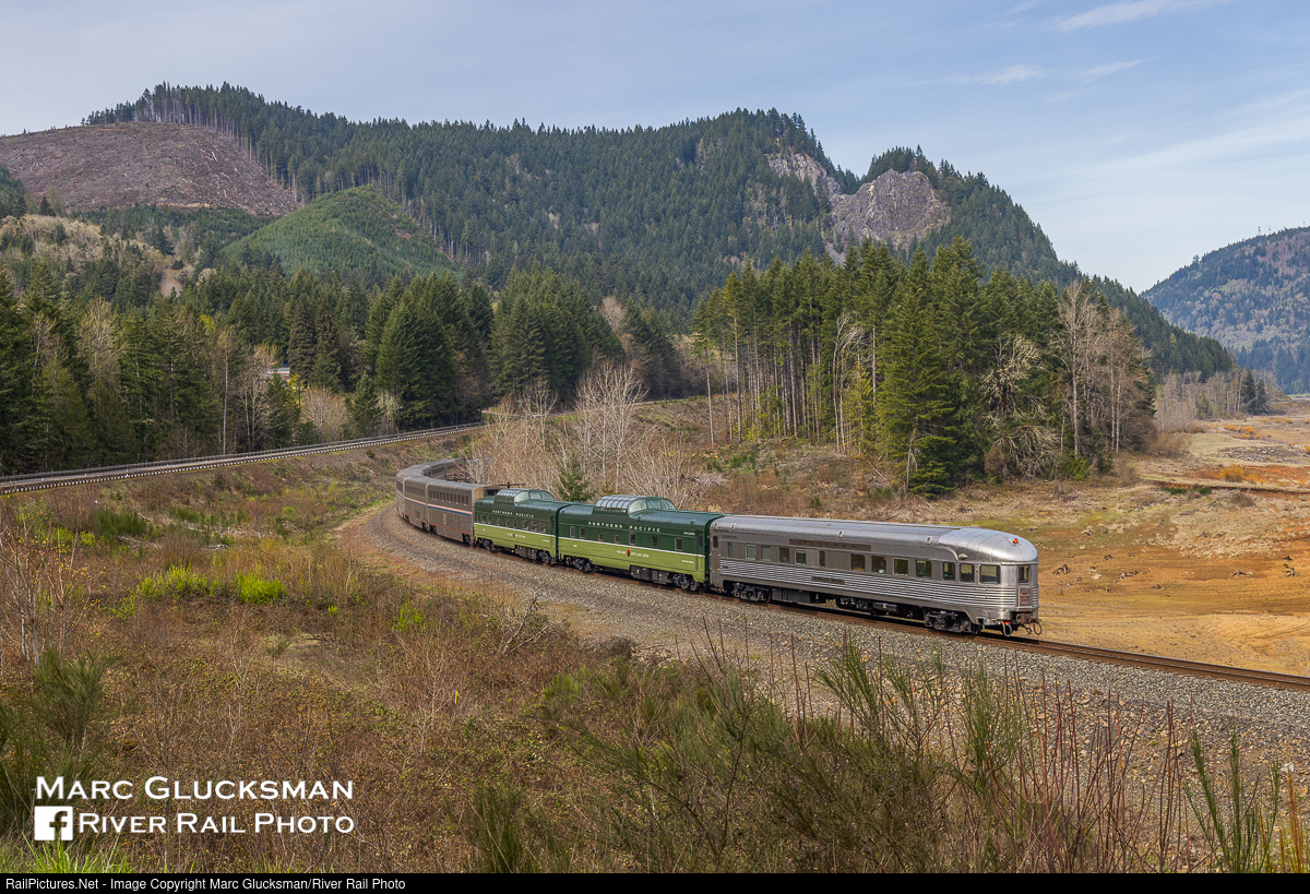 Lookout. On Sunday, March 27, 2022, the Amtrak Coast Starlight (Train 14) had a nice addition as Webb Rail's former Northern Pacific Railway Budd built Pullman dome/sleeper 313 (WEBX 801044), former Northern Pacific Railway Budd built dome/coach 549 (WEBX 801045), and former New York Central Railroad Budd built Pullman obs/diner/sleeper "Babbling Brook" (WEBX 800007) held the markers as it passed Lookout Point Lake in Lowell, Oregon. The train would arrive in Seattle, Washington that night before the same consist would turn for Los Angeles, California the next day. More on the Webb Rail fleet at www.webbrail.com