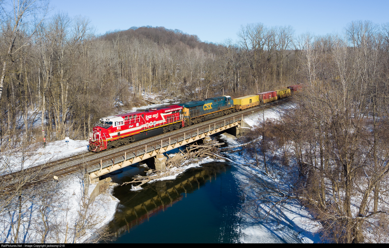 | CSX train I009 with CSX 911 the "Spirit of our First Responders" unit leading crosses over Ganargua Creek in Palmyra, NY on a sunny January morning. |
