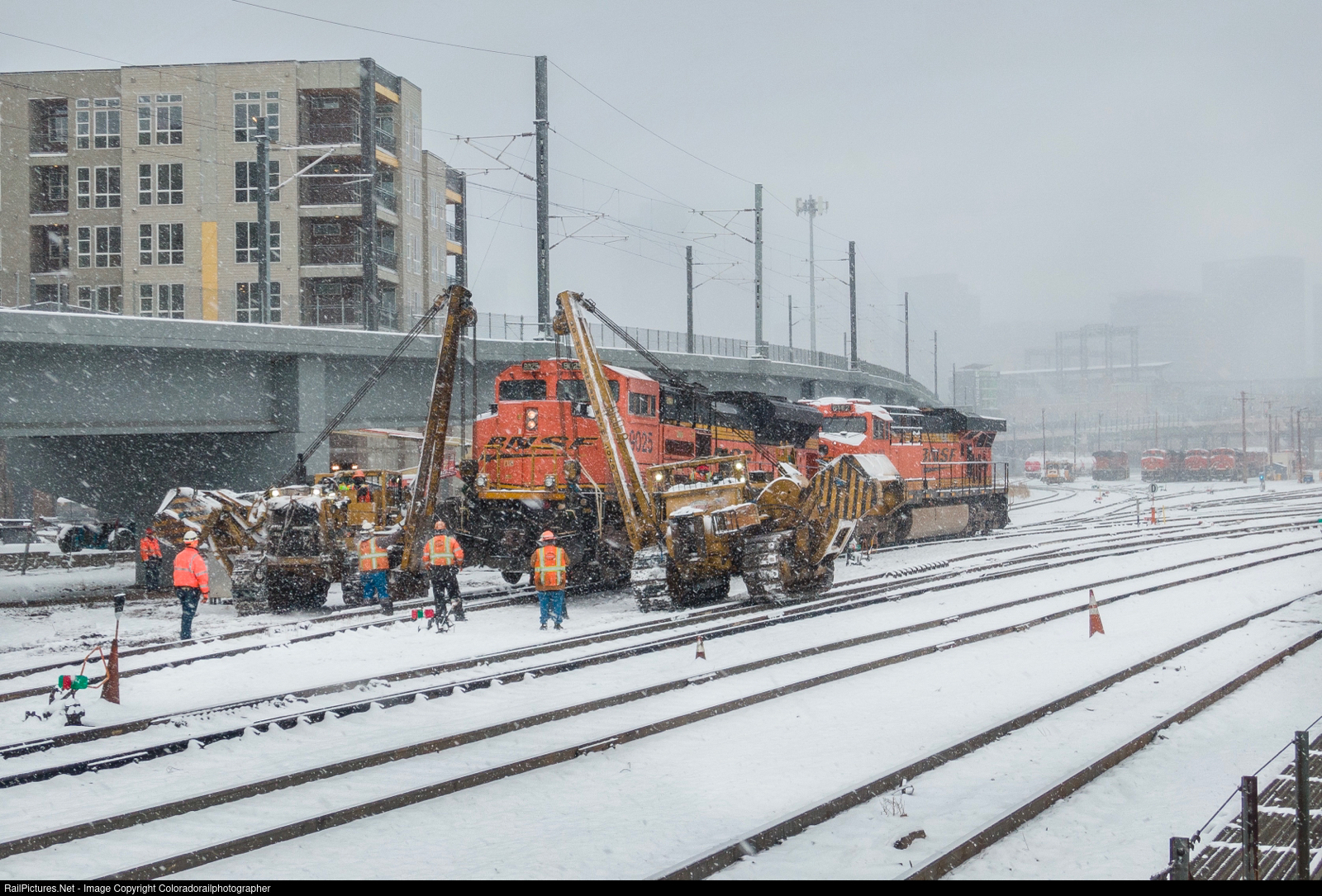 Teamwork on a snowy cold morning in Denver, CO. BNSF 9025 gets a helping hand back on the track after running on the ground. 2/6/22 |