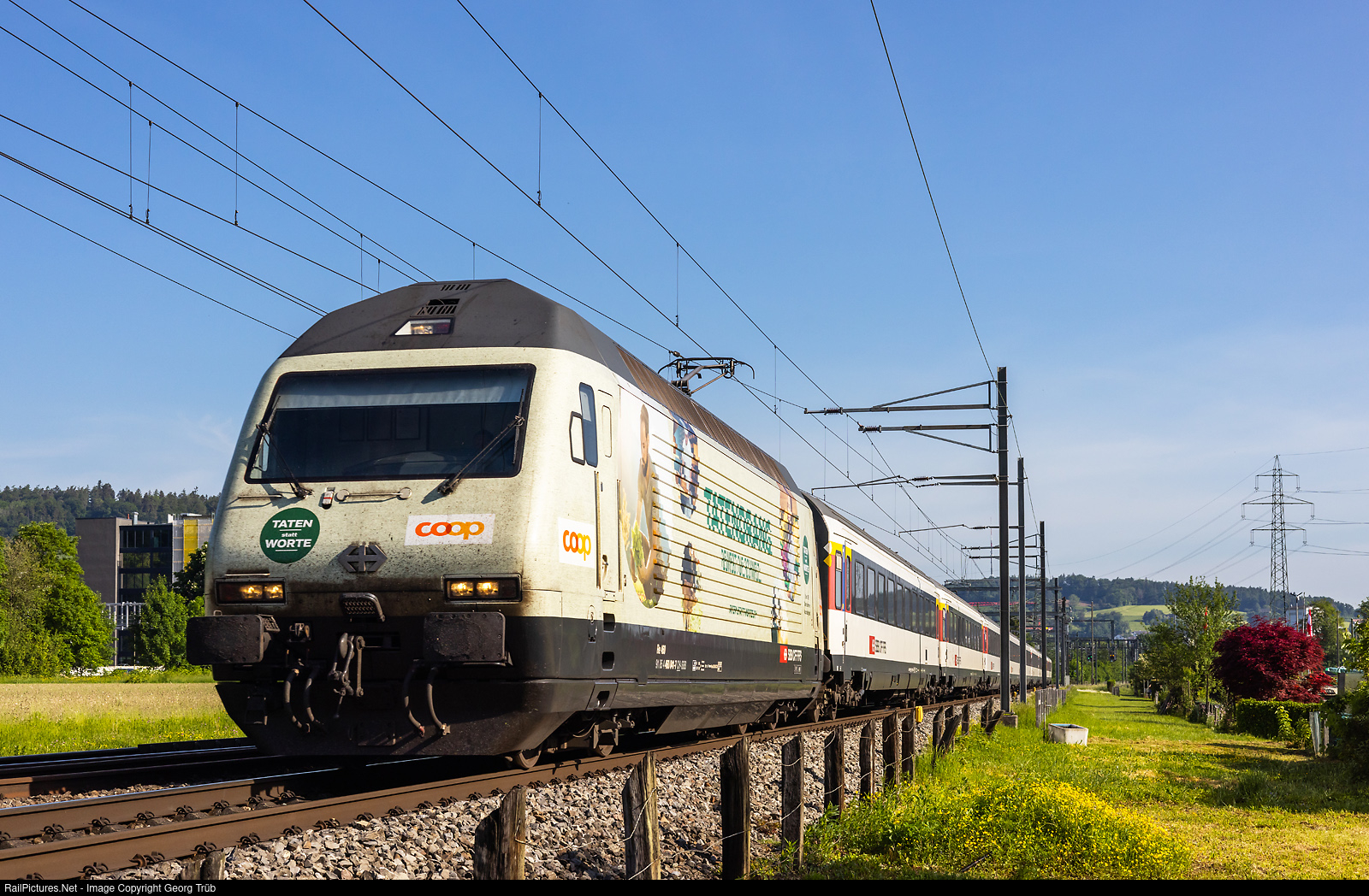 | Re 460 # 041 of the SBB in the publicity paint scheme for Coop (large swiss retailer) is pulling the push-pull train IR 2112 (standard cars type IV) of the line IR 75 from Constance via Weinfelden-Winterthur-Zürich-Zug to Lucerne, through Winterthur Tössmühle. |