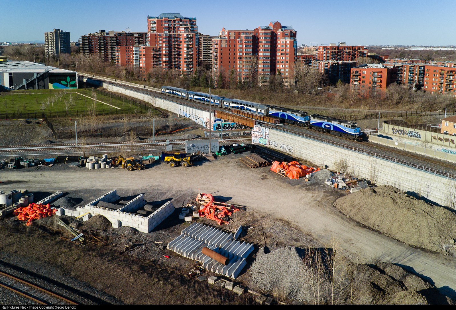 In the foreground is the construction site of the new REM network which will use electric light rail trains, here on the former CN Deux-Montages line. The connecting track in the bottom corner is not cut and out of service. This connection and a short stretch of the St-Laurent Sub were electrified for some short years before construction for REM started. |