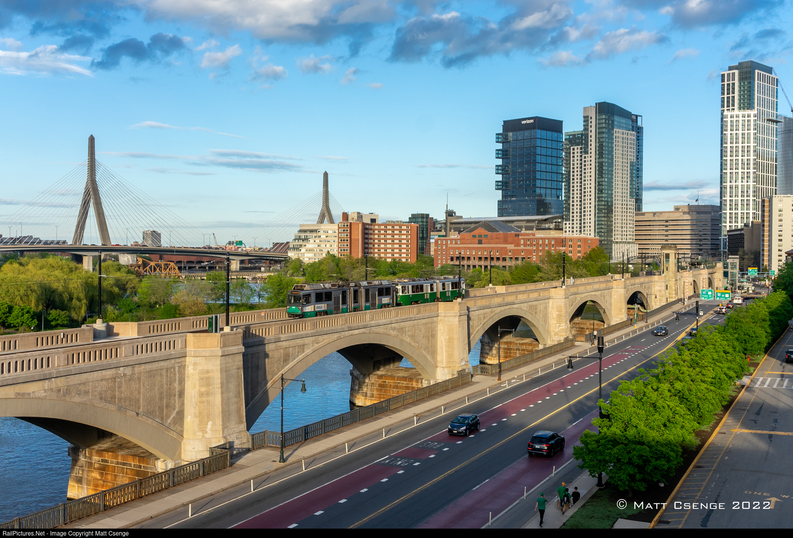 MBTA 3888 is seen leading a Green Line (E) train over the Lechmere Viaduct, crossing the Charles River into Cambridge, MA. The AnsaldoBreda Type 8 LRV is paired with an older Kinki Sharyo Type 7 LRV, as the Type 8's are low-floor for accessible boarding whereas the Type 7's are high-floor. The parking structure at the Museum of Science provides a great vantage point for views of the viaduct and skyline. The rolling lift bridge and tracks on the MBTA commuter rail line into North Station can be seen in the background as well. |