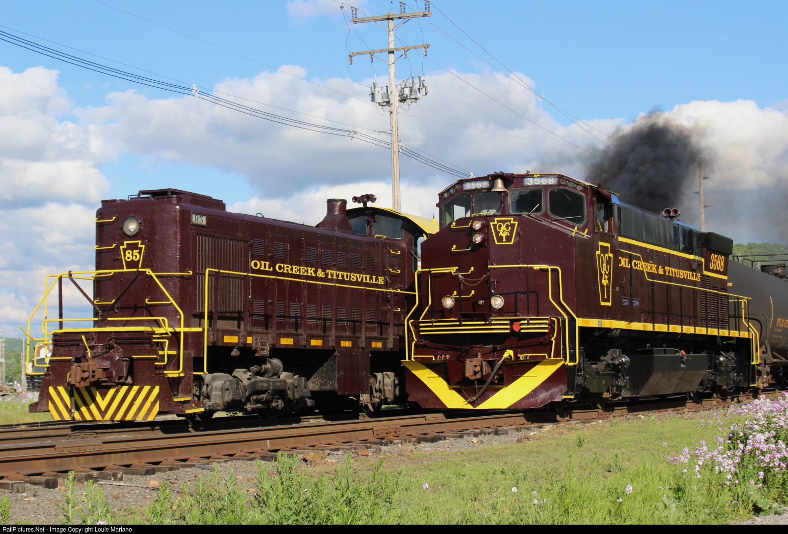Freshly painted Oil Creek & Titusville M420 #3568 pulls a photo freight through the yard at Titusville past the idling S-2 #85.