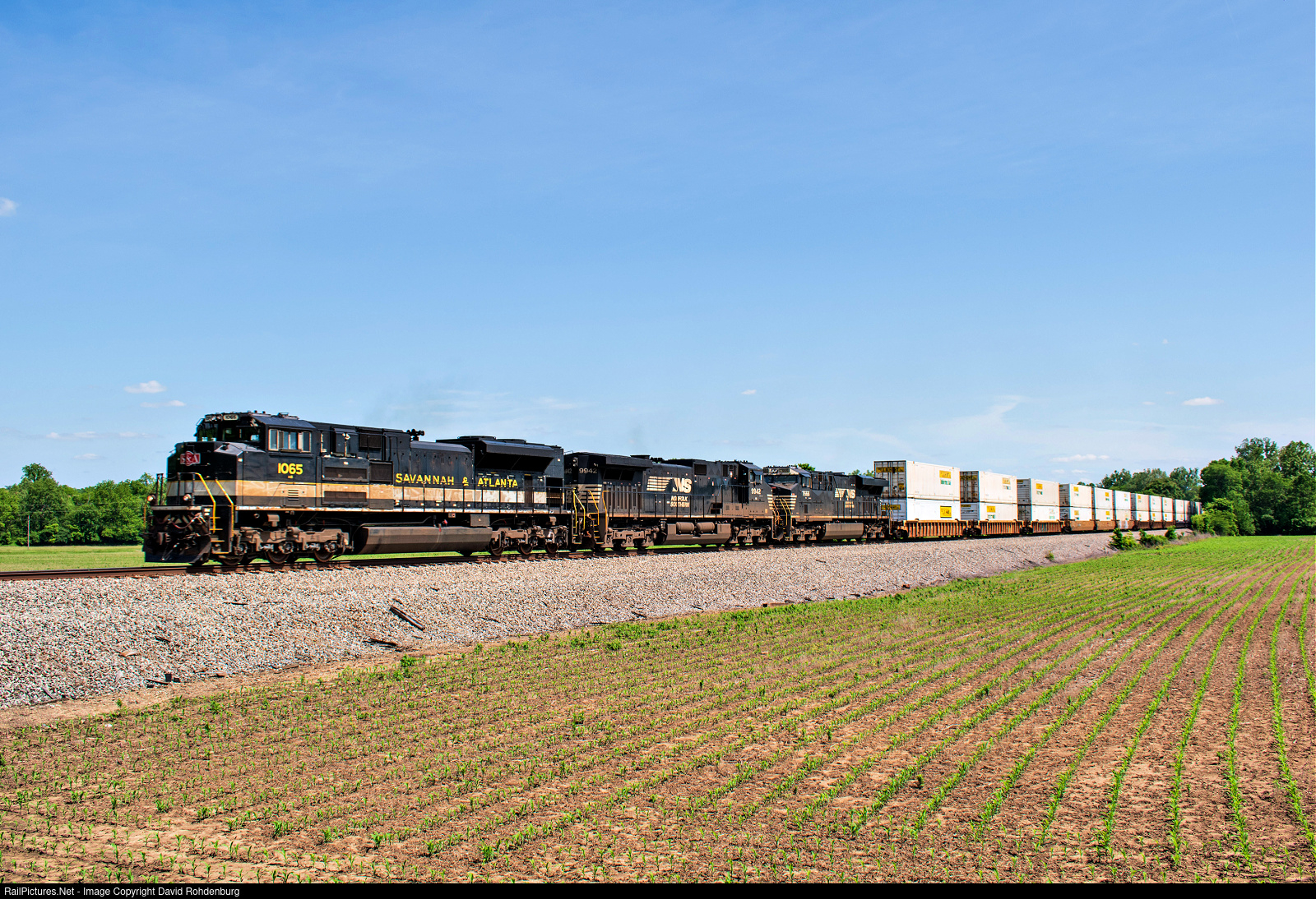 Finally getting up to track speed after running on Approach signals for several miles, the NS Savannah & Atlanta Heritage Unit, NS 1065, leads intermodal train 216 as it highballs west on the New Castle District, seen here passing a freshly planted field near Somerville, Ohio.