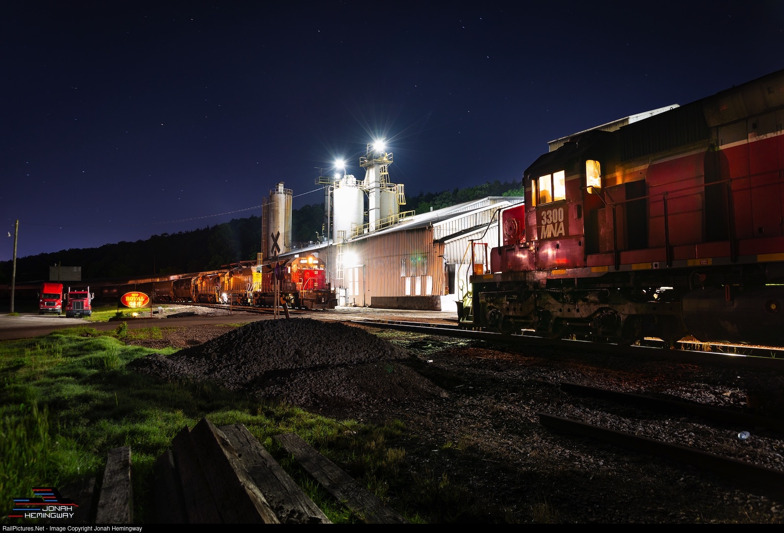 | The MNA Carthage South Local and Cotter North Local meeting at Gretna siding next to Royal Oak Charcoal. The two trains meet here so the crews can swap trains and head back to their originating points, rather than get a ride all the way back to Carthage or Cotter. These two trains also featured the last two six axles on the MNA that still wear the Railtex Red paint. |