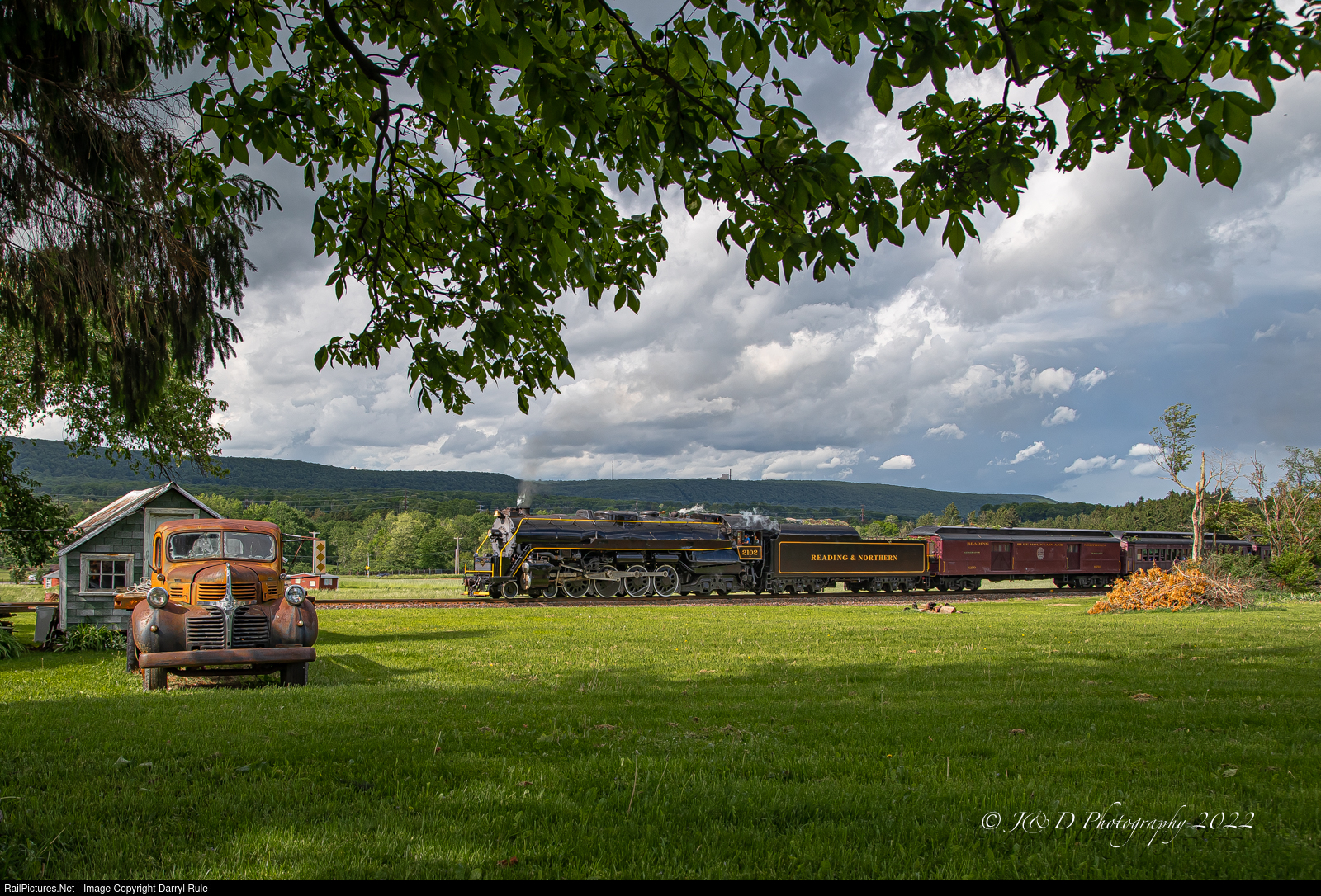 After a dreary morning run to Jim Thorpe, the sun has joined the thousands out chasing former Reading T-1 #2102 pulling its first Ramble of its reborn career, The train is seen here approaching the Church Rd crossing. Fot full disclosure - a flag pole has been removed from the photo.