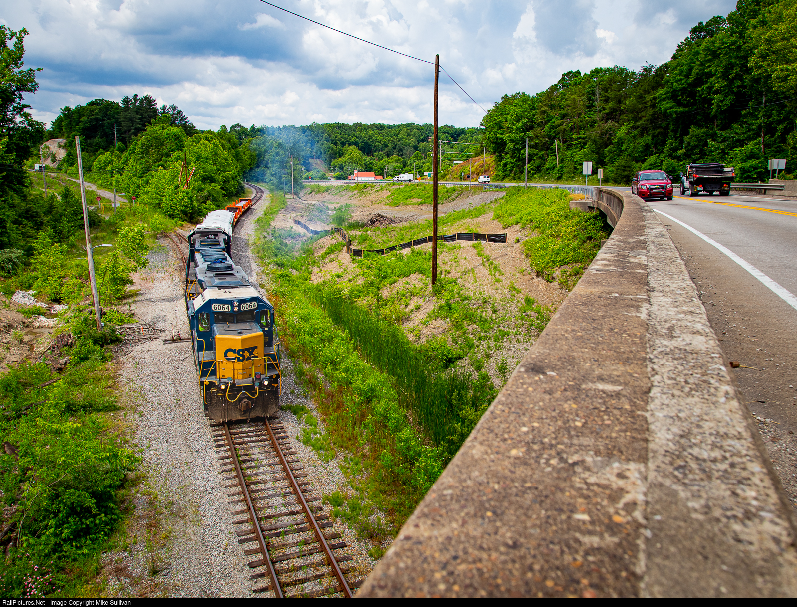 In a rare daylight move, Y102-03 heads back towards Russell Yard on the former C&O Lexington Subdivision mainline, passing the now-closed Big Run Landfill transload spur with 4 cars from SWVA Kentucky's mill at the end of the 11-mile spur. Major work is underway to widen US 60 between the KY 180 and I-64 interchanges, eventually leading to the removal of the two-lane bridge over the Lexington IT, changing this scene forever.
