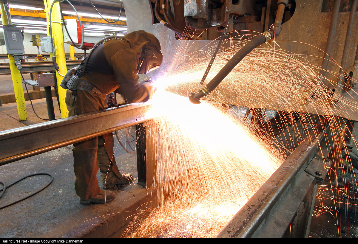 A welder makes repairs to the plow on Union Pacific GE AC4400CW No. 6344 inside the Diesel House at UP’s Burnham Shops at Denver, Colorado, on the evening of December 8, 2015.