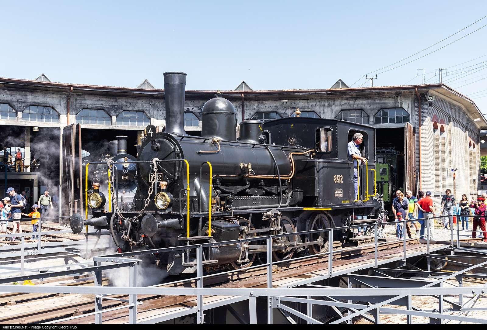 0-6-0 T shunting locomotive E 3/3 # 8512 "Tigerli" of SBB Historic, made operational, maintained and operated by the steam group Zürich, on the turntable of Brugg AG. The locomotive with platform for the staff in front of the smokebox and a chain for special shuntings, was built by SLM in 1911 and withdrawn by the SBB in 1965. For some years it was exhibited in the Swiss Museum of Transport in Lucerne (VHS), then stabled in St-Maurice, for some time outside rusting away. Rescued by the steam group Zürich in 2021, transported to Brugg on the road and made operational again in a few months. During the open doors days 2022 in the Railway Park Brugg AG, the locomotive made the shuttle to the station together with E 2/2 # 1.
