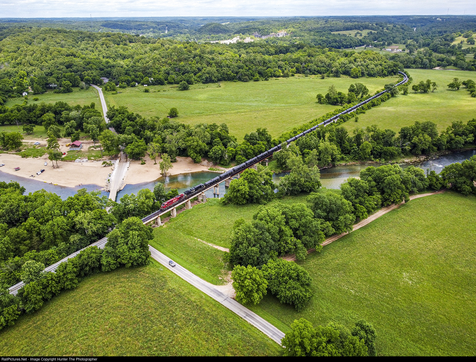 | A unit oil train from Canada heads south on the Kansas City Southern main line, crossing the Elk River in Ginger Blue, MO on a warm June 6, 2022. |