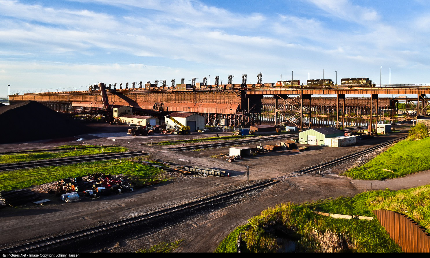 | The sun rises above Lake Superior as the first ray of sun shines on Dock 6 while IC 6251, 6252 and CN 5244 unload ore at the docks. 6251 is the last IC SD40-3 still in service with white frame stripes. |