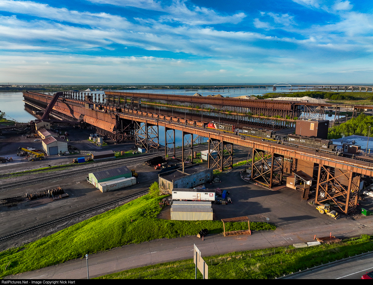 It's a beautiful morning at CN's Dock 6 in Duluth, as IC 6251, IC 6252 and CN 5244 unload a train of iron ore.