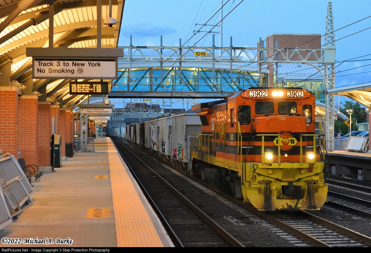 | At the beginning of blue hour, Providence & Worcester train CT-2 passes West Haven Station as it makes the trip to the Tilcon plant in Danbury. Bracketing the 25 loads of aggregate hoppers is B39-8 3902 with another B39-8 and B40-8 on the rear.