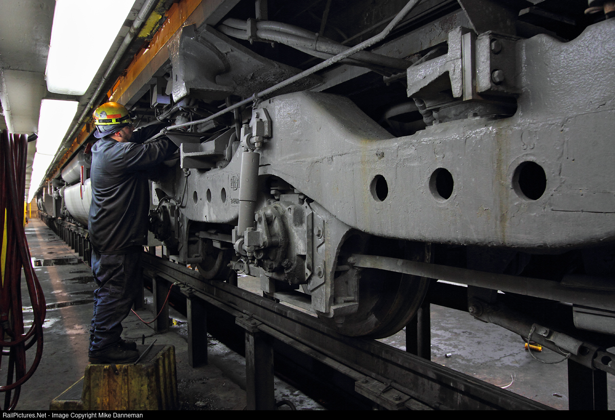 Union Pacific EMD SD40N No. 1826 has some repair work done on the just above the big HTC truck in the Diesel Shop at the railroad’s Burnham Shops in Denver, Colorado, on December 17, 2015.