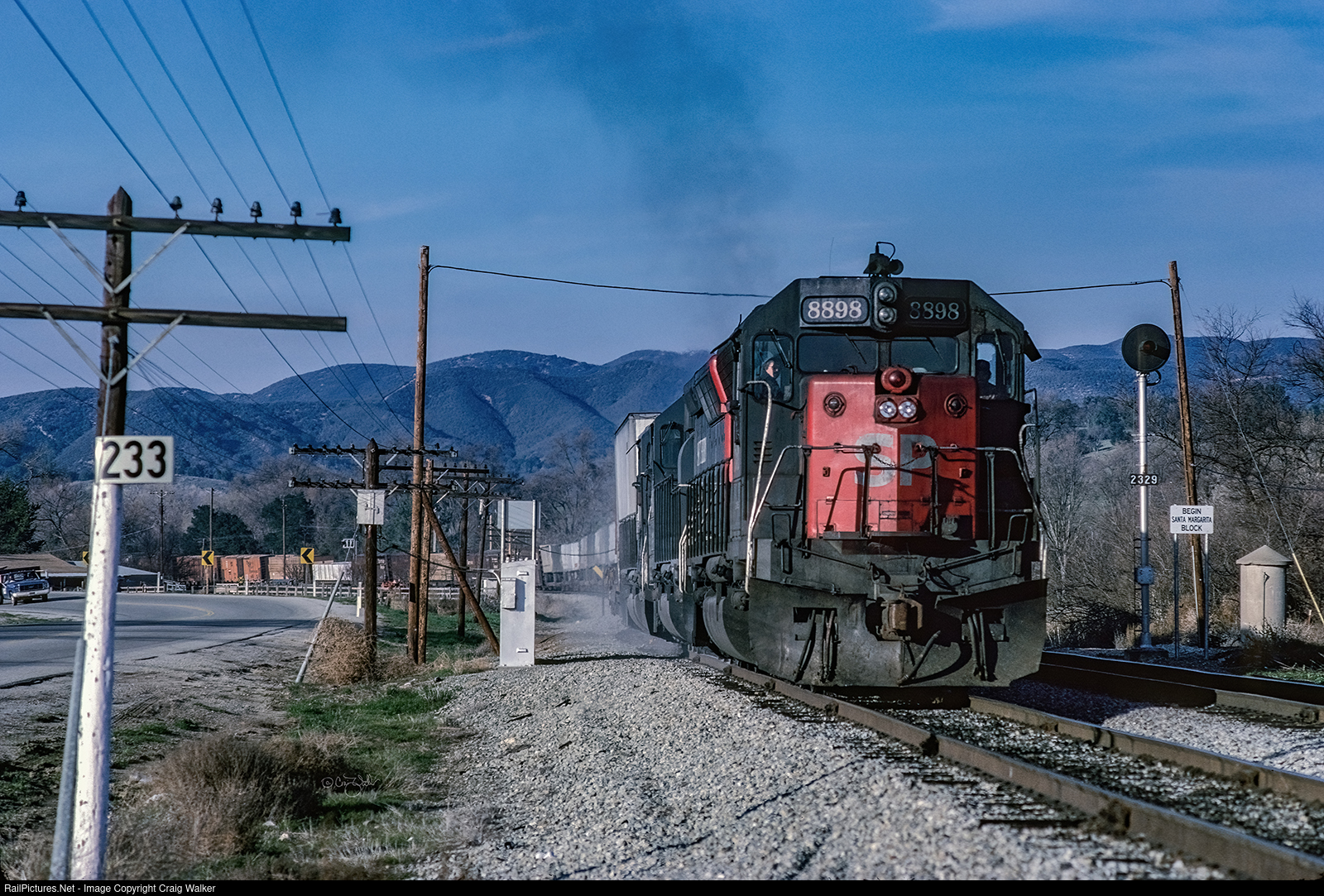 Rolling southward freight (eastbound in Southern Pacific parlance), a trio of EMD SD45s, consisting of SP 8898, 9120 and 9100, is nineteen miles from San Luis Obispo, at which point this crew will be relieved by a fresh crew. But between here, the SP station Cushing, and there lies the summit of the Santa Lucia Mountains’ Cuesta Grade, five miles ahead, and then it is all downhill, and through five tunnels, to get to SLO. The new crew will have a great view of the Pacific Ocean on their right side for much of their journey! (Santa Margarita, California – January 12, 1985)