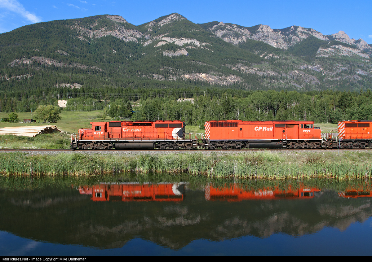Canadian Pacific’s wayfreight between Cranbrook and Golden heads north through Brisco, British Columbia, on the afternoon of July 17, 2011. Two SD40-2s bracket a SD40-2F “red barn” as power on this train running on CP’s scenic Windermere Subdivision.