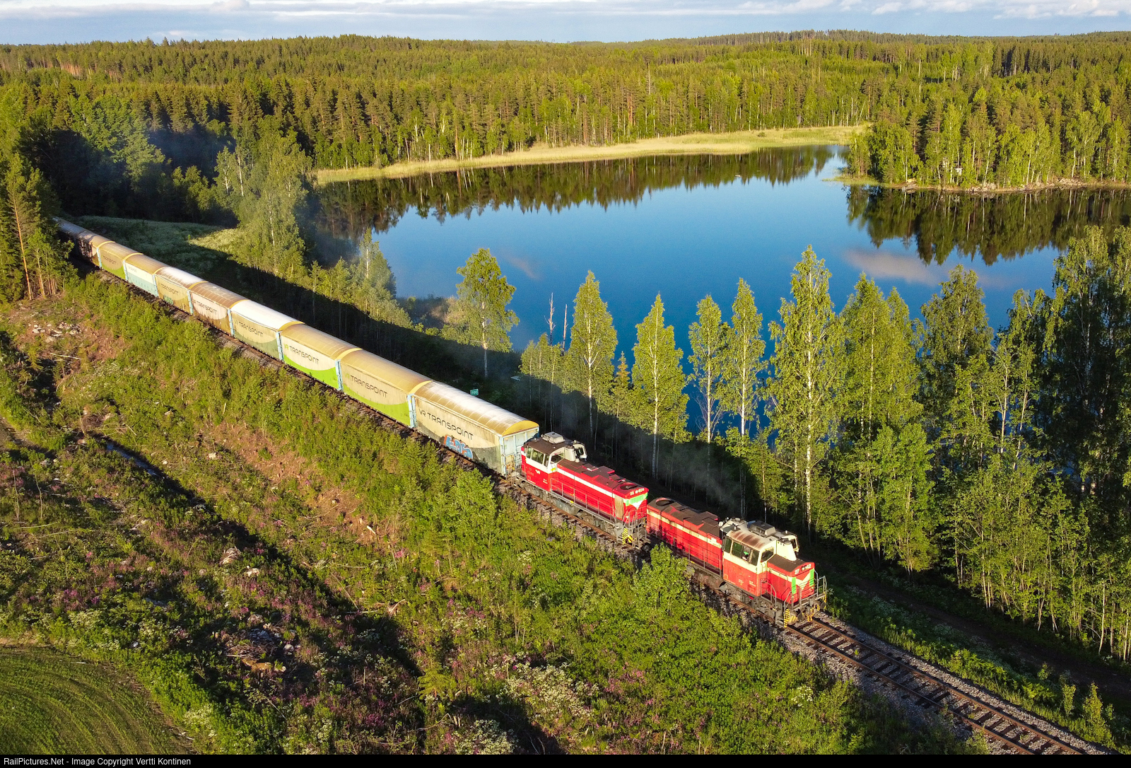 Pair of Dv12 class diesel hydraulic locomotives pulling the daily Ristiina-Kouvola plywood train out of Ristiina yard