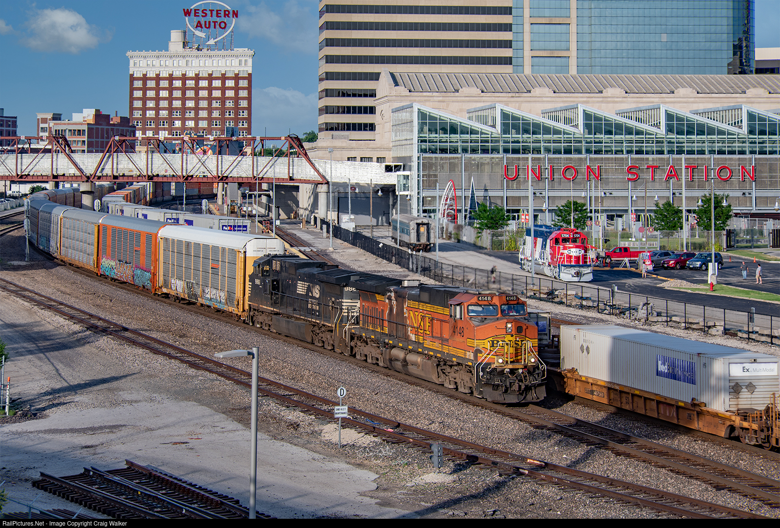 Heading west from Blue Island, Illinois, to San Bernardino, California, is BNSF Railway automobile train B-BLUSBD1-17. A pair of Dash 9-44CWs, BNSF 40148 and Norfolk Southern 9861, are the power for this train. In 2022’s world of endless look-alike GEVOs, two 18 to 20-year-oldish Dash 9-44CWs seems like archaic power, but over on Union Station’s Track 27 is a real throwback locomotive: Recently restored Santa Fe SD45-2 5704, resplendent in its 1976 to 1978 Bicentennial paint job. (Kansas City, Missouri – June 18, 2022)